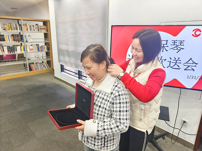 工会副主席周正华代表公司致辞,高度赞扬何女士扎根岗位、默默奉献的职业精神,并亲手为何女士佩戴退休慰问纪念品——珍珠项链,送上诚挚祝愿:愿她荣休后生活美满、福寿安康,开启人生崭新篇章,万事顺遂如意。现场随即响起热烈掌声,将活动气氛推向高潮。