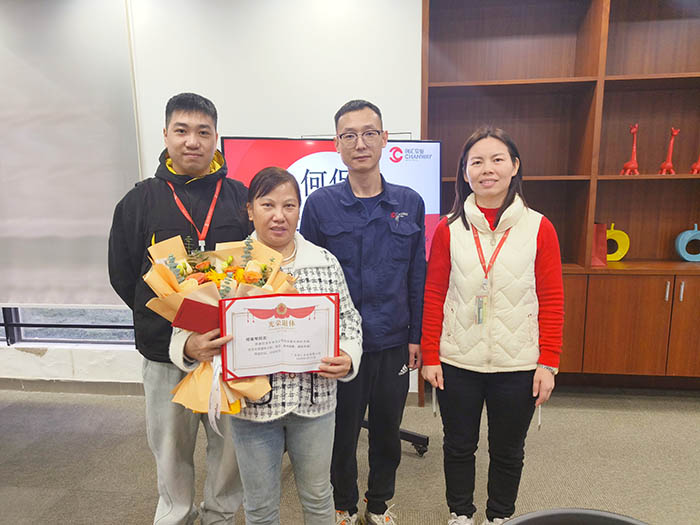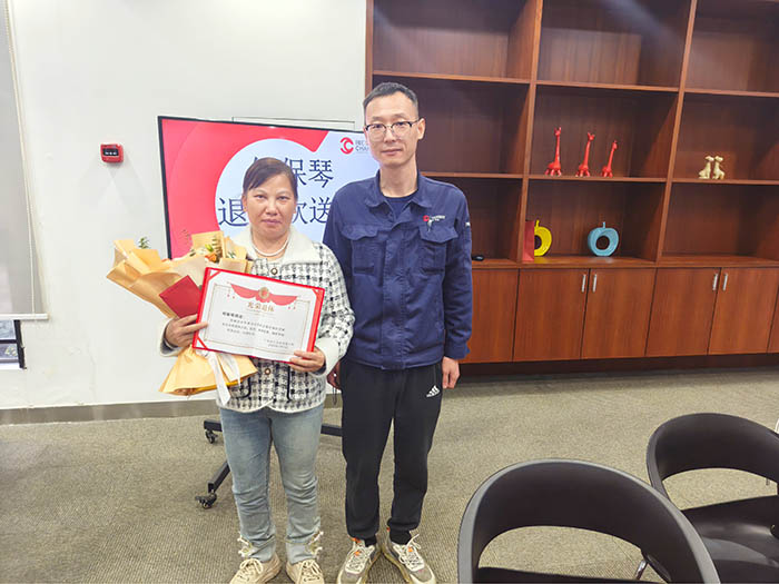 随后,周副主席为何女士颁发荣誉证书、退休红包与鲜花,传递企业深深的关怀与温情。何保琴女士双手接过这份沉甸甸的心意,脸上洋溢着幸福的笑容,频频向大家致谢。