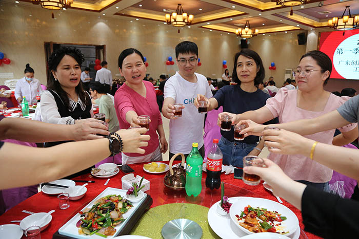 切蛋糕仪式结束后,丰盛的围餐正式上桌,大家举杯同庆,共享美食。